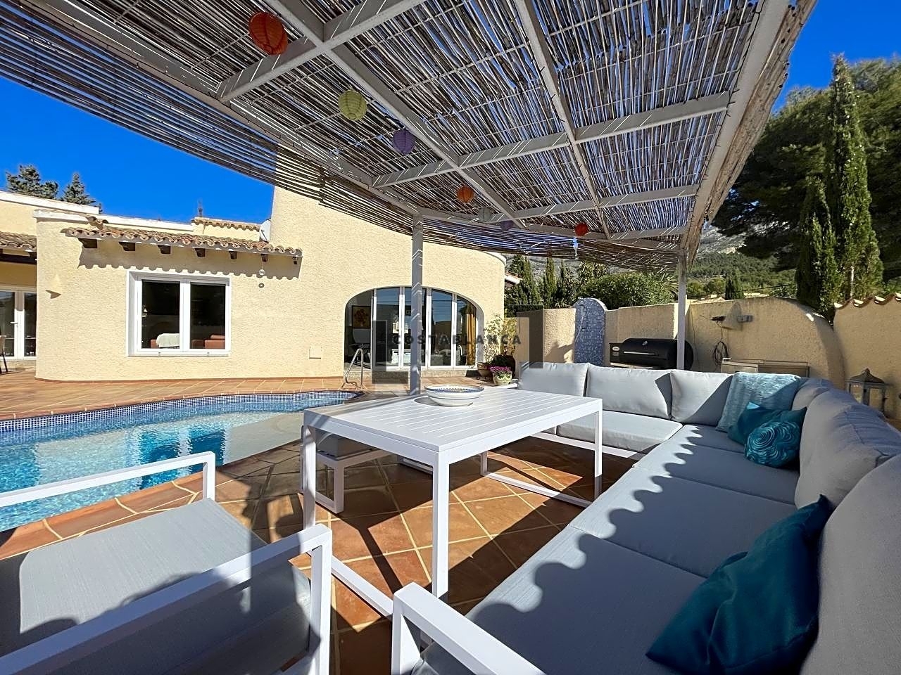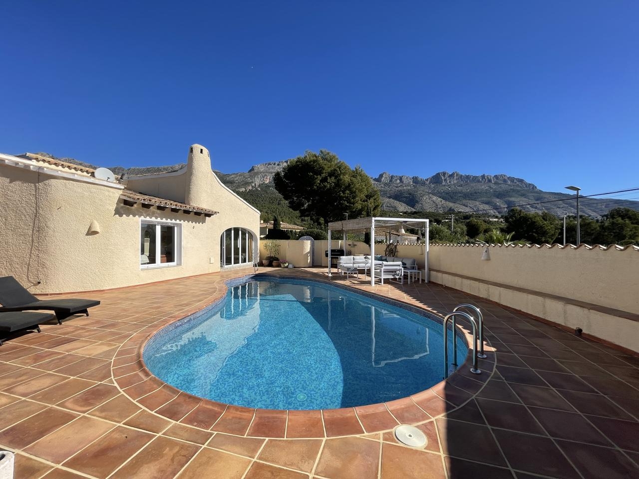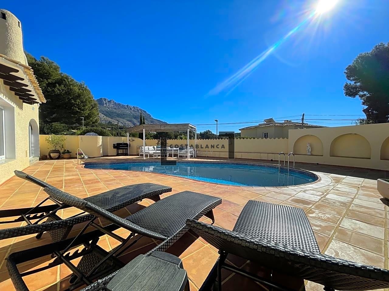 ¡Bienvenido a la casa de tus sueños! Esta acogedora villa es una joya rara en el corazón de un barrio codiciado. Todo en una sola planta, esta espaciosa propiedad cuenta con un cálido y acogedor hall de entrada, que conduce a una sala de estar completa con una acogedora chimenea.La cocina americana totalmente equipada con comedor es perfecta para celebrar reuniones y entretener a los invitados. La villa cuenta con otro salón con acceso directo a la piscina, rodeado de amplias terrazas, un lugar ideal para tomar el sol y relajarse.Con 4 dormitorios y 2 baños, hay mucho espacio para que disfrute toda la familia. El garaje tiene capacidad para 1 automóvil, mientras que el área de estacionamiento es perfecta para varios automóviles más.Equipada con aire acondicionado fríocalor, riego automático y sistema de alarma, esta villa está diseñada para garantizar su comodidad y tranquilidad. Además, cuenta con una envidiable posición orientada al sur, que ofrece impresionantes vistas de la Sierra Bernia y mucha privacidad.No se pierda esta increíble oportunidad de poseer un pedazo de paraíso en este lugar tan deseable. ¡Contáctanos hoy para programar una visita y experimentar el estilo de vida que te mereces!