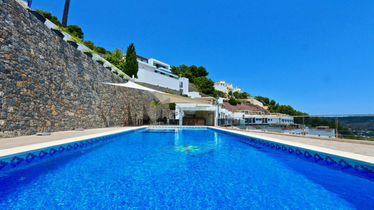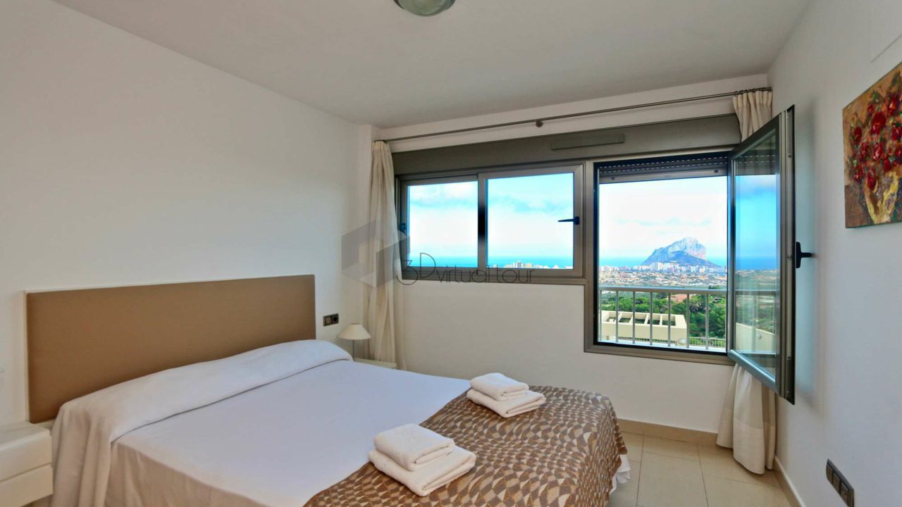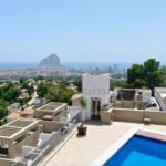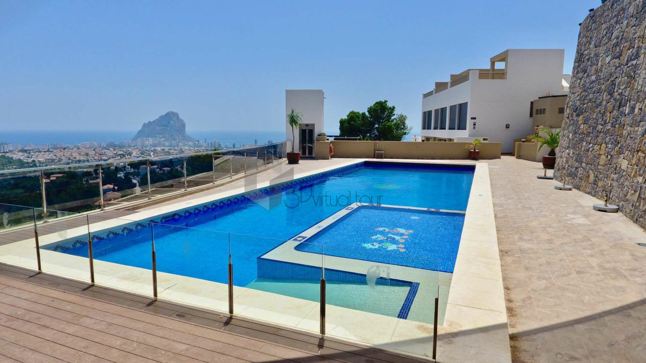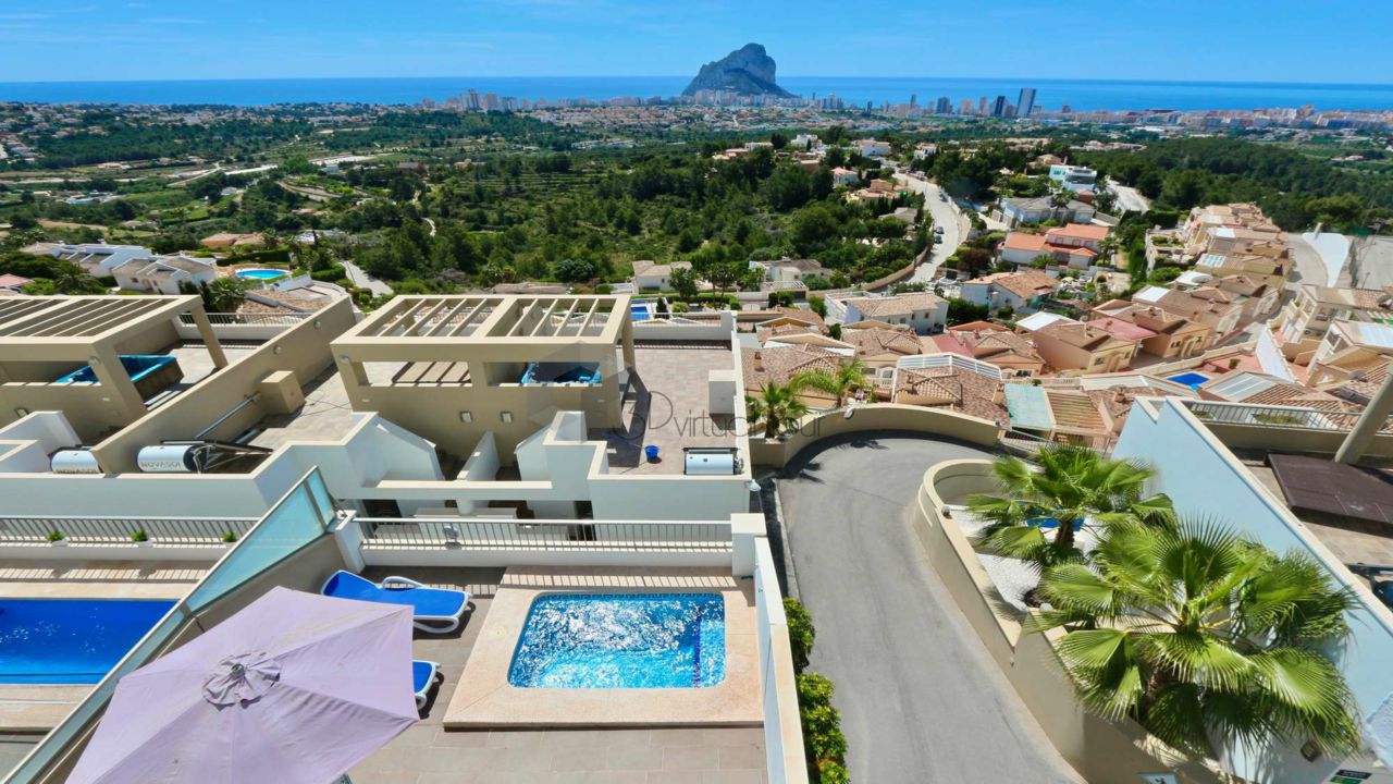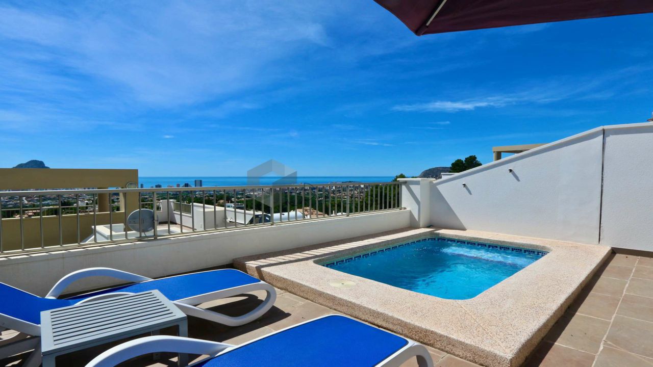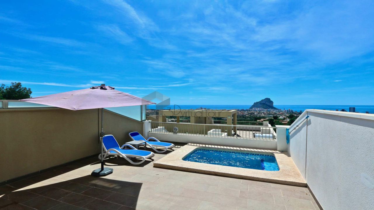 VA547CI. Se alquila un bumgalow en Calpe, con impresionantes vistas al mar. En la planta principal hay una cocina, un baño de cortesia, una amplia sala de estar con salida a la una gran terraza abierta con la piscina, vistas al mar. En la primera planta hay 3 dormitorios y 2 baños. Tambien hay un solarium con jacuzzi con impresionantes vistas al mar. Landry, Parking numerado. Piscina privada y comunitaria.