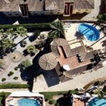 El exterior de la villa le da una sensación de estilo de castillo con mucho espacio abierto y zona chill out y barbacoa rodeada de hermosas palmeras.
