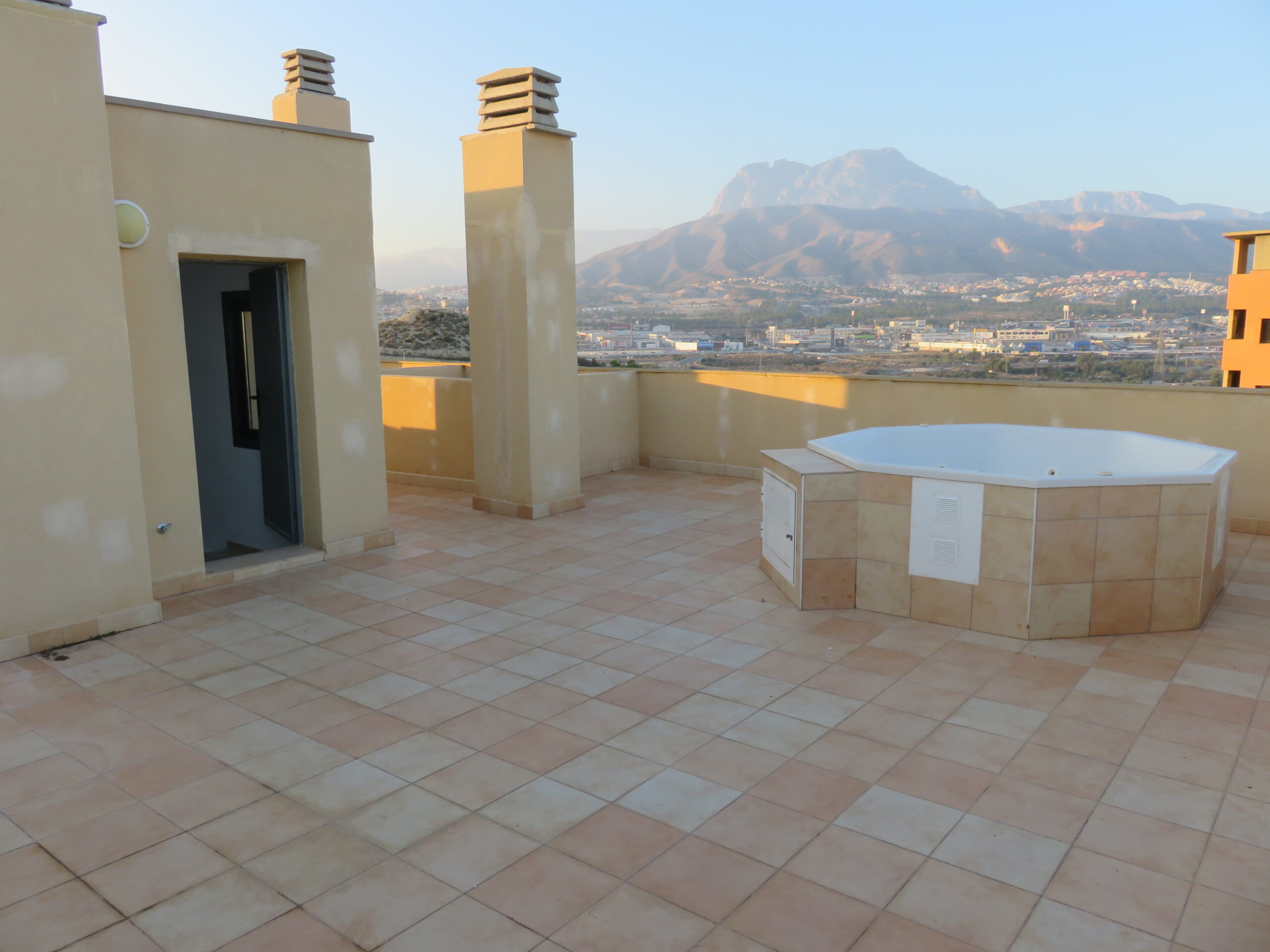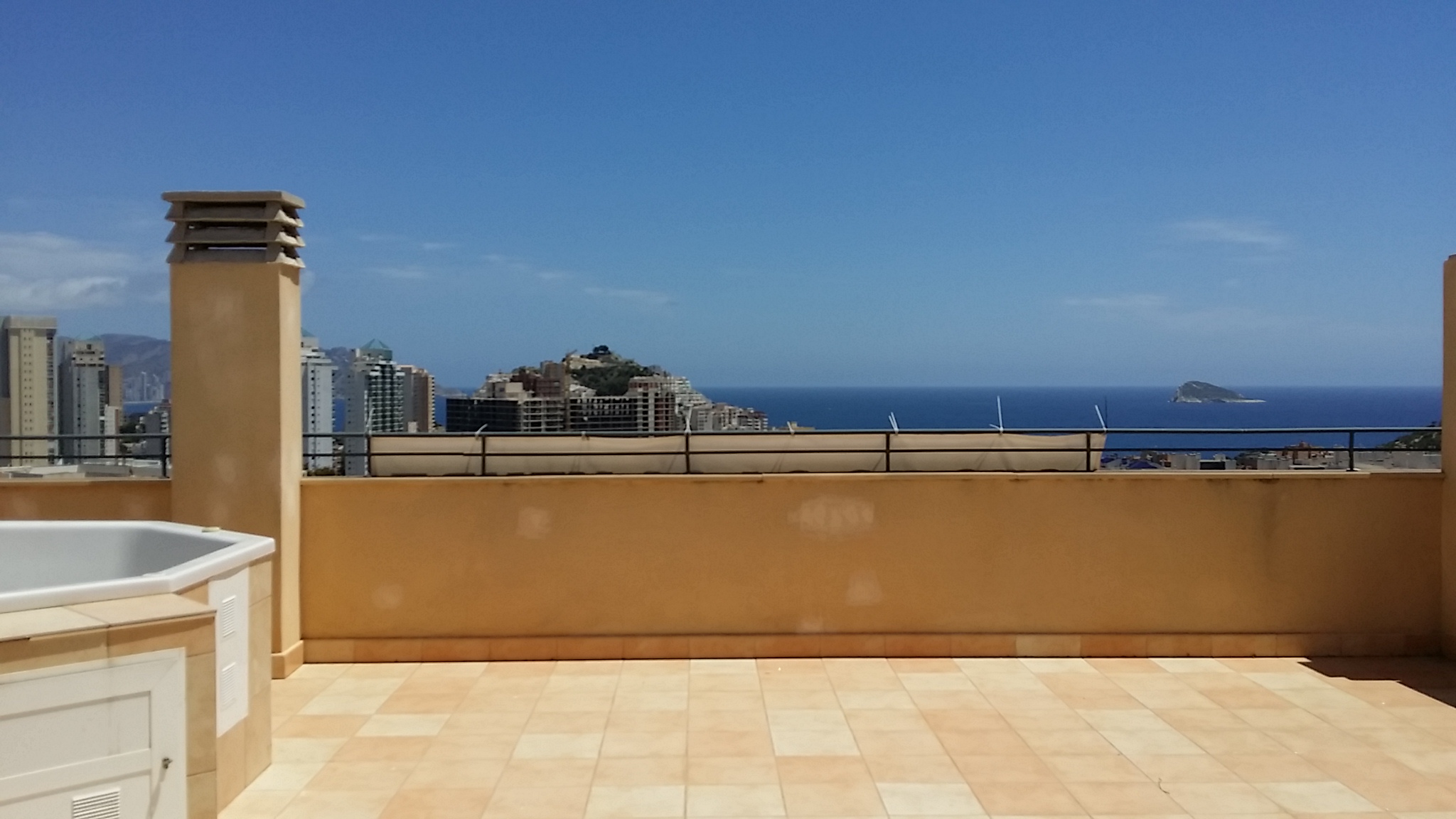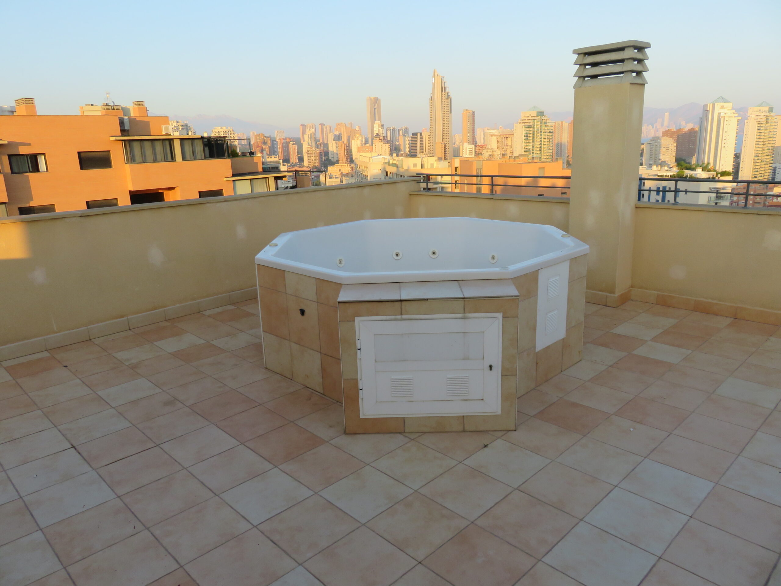 Se vende un atico en Villajoyosa. Dispone de tres habitaciones con armarios empotrados, tres baños, una sala de estar combinada con el comedor, una amplia terraza con preciosas vistas al mar y a las motañas, una cocina equipada y una escalera de acceso al solarium privado, el solarium contiene un jacuzzi relajante con hidromasaje de ocho plazas. Tiene una plaza de parking y un trastero situados en la planta de sótano, incluidos al precio.