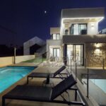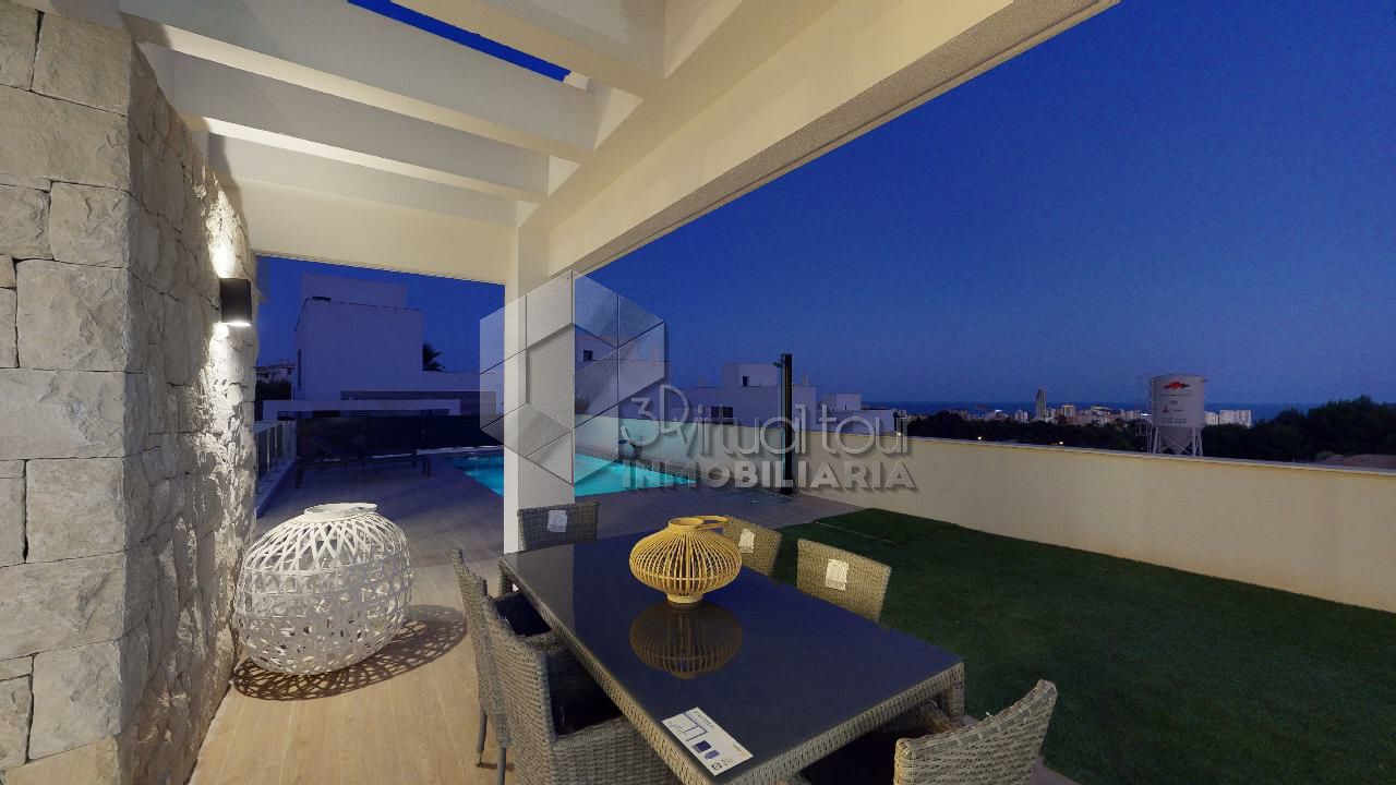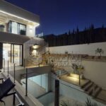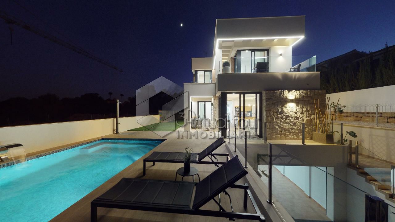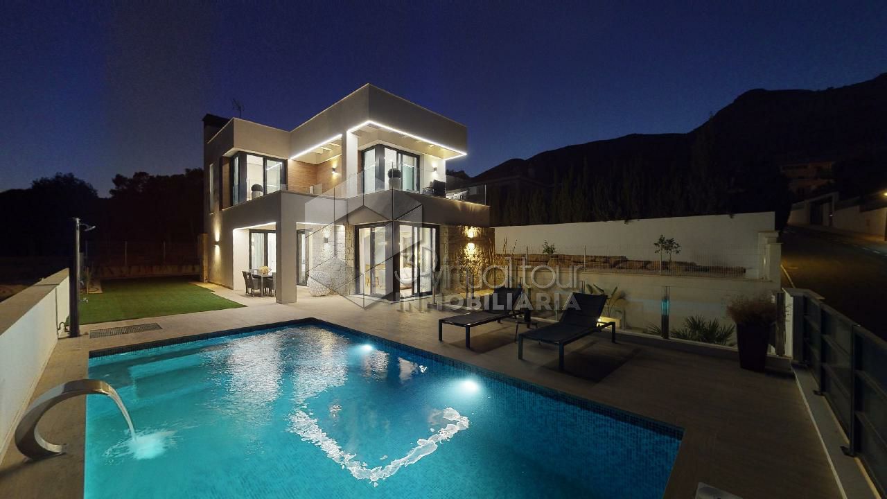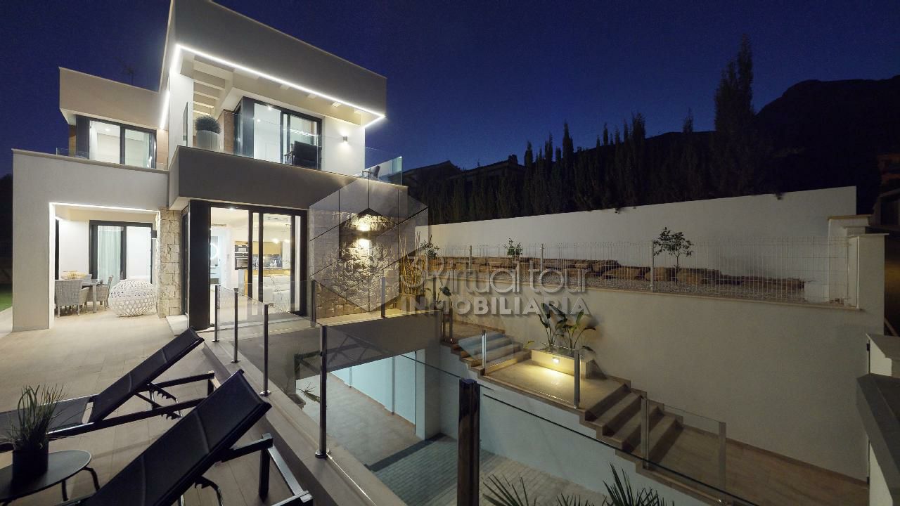 Se vende villa moderna de obra nueva, con vistas al mar y las montañas. Construcción moderna con tecnologías nuevas. Villa es de 2 plantas mas planta abajo del garaje. En la planta principal se encuentra una amplia sala de estar con la salida a la terraza, jardín y piscina privada. Cocina americana, un dormitorio en suite. La segunda planta se distribuye en 2 dormitorios, 2 baños completos y una terraza .Garaje, Parking.